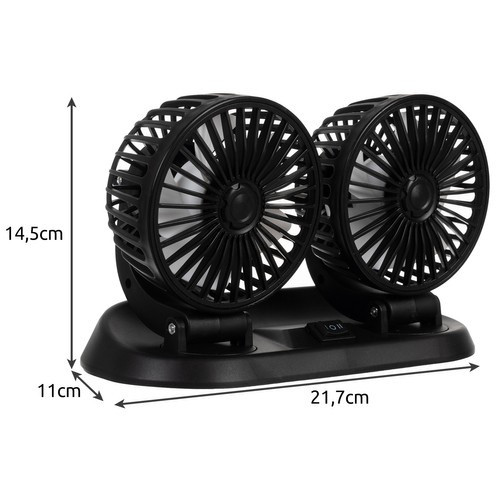 Praktikus dupla fejű autóventilátor, amely 360°-ban forgatható, két fokozatban szabályozható, és a szivargyújtóról működik. Ideális hosszabb utakhoz, nyári melegben vagy akár kamionban, buszban, lakóautóban is.