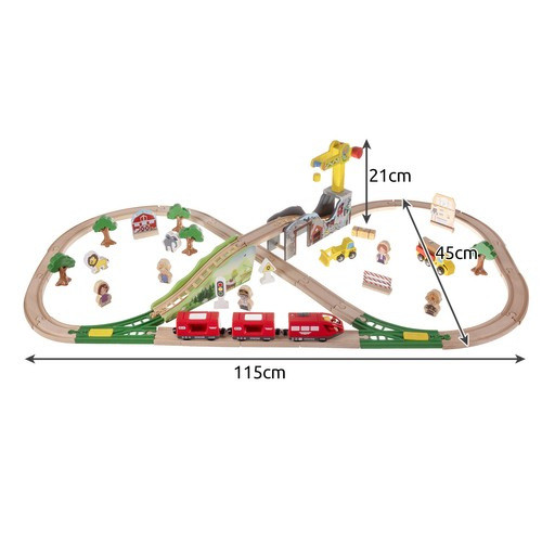 Nagy méretű, 57 elemből álló fa vonatkészlet 3,2 méteres pályával, vonattal, járművekkel, állatokkal és kiegészítőkkel. Fejleszti a képzelőerőt, a kézügyességet és hosszú órákon át szórakoztatja a gyerekeket.
