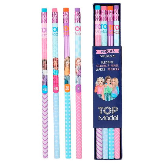Minden ceruza egy TOPModel siker: a négy színes ceruza örömteli dizájnnal és nagyszerű modellek motívumaival készült.
