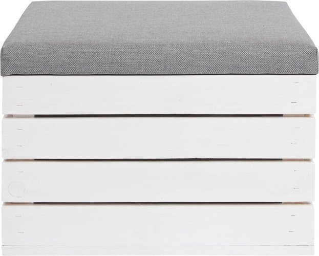 A puff erős, szárított és gyalult lucfenyőből készült, amit kiváló minőségű akril festékkel és lazúrral kezeltek. Széles (akár 13 cm-es) lécei tartósságot és stabilitást biztosítanak. Az ülőfelület nagy rugalmasságú T-25 habszivacsból készült, szürke szövettel kárpitozva, így nemcsak ülésre, hanem lábtartónak, cipőfelvételhez segítő bútorként vagy akár erkélyasztalként is használható.